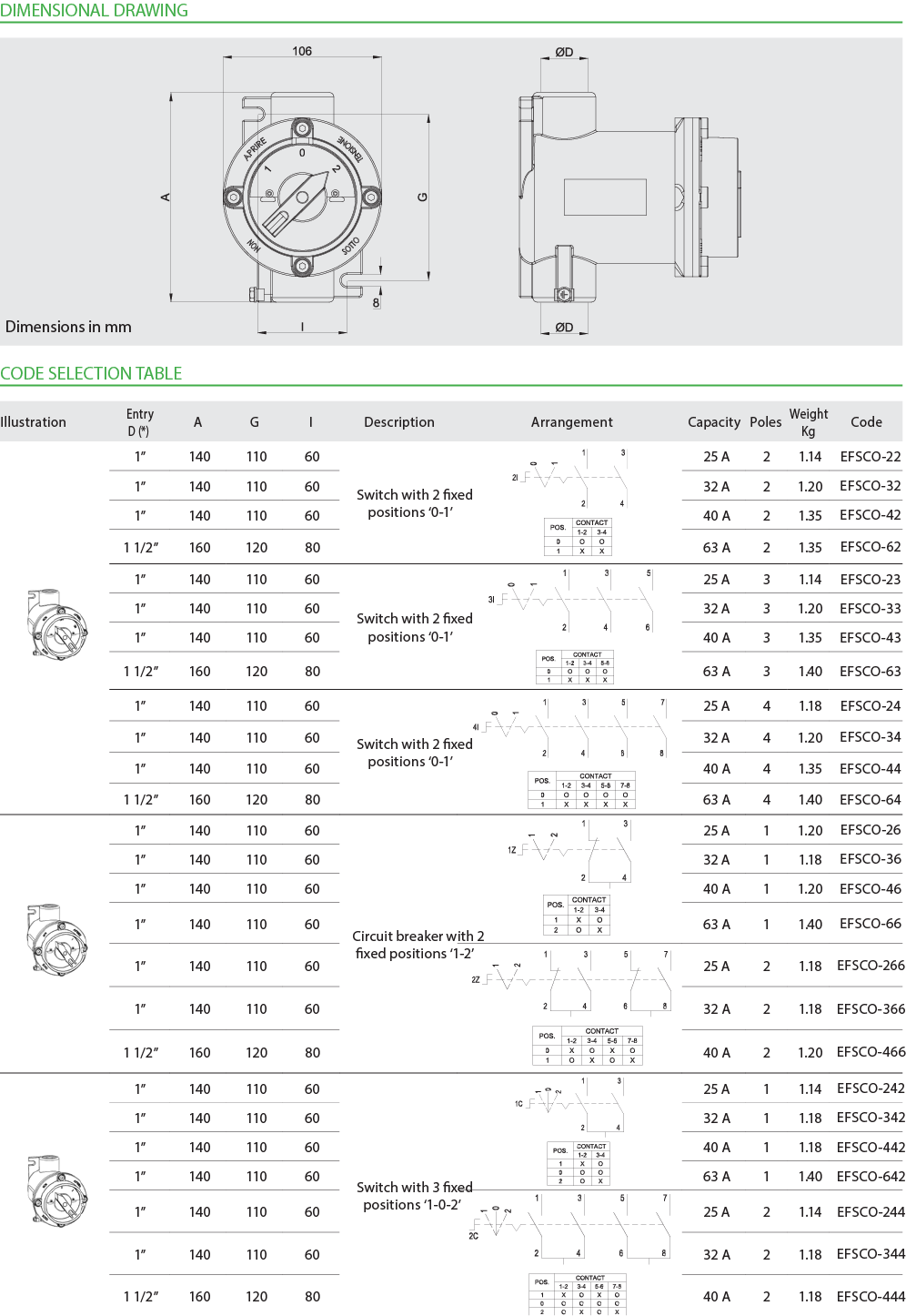 Các công tắc, cầu dao và bộ chọn tạo nên dòng sản phẩm EFSCO là loại xoay 25, 32, 40 và 63 A với tay cầm điều khiển phía trước