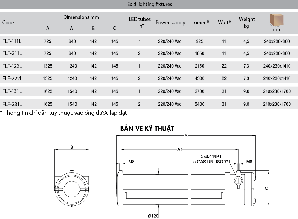 Đèn tuýp LED dòng FLFE-…L (Ex de) và FLF-…L (Ex d) có hai đầu đèn bằng nhôm hàm lượng đồng thấp, được trang bị đui đèn G13, thân đèn bằng thủy tinh borosilicate cường lực chịu được sự thay đổi nhiệt độ và chóa đèn bằng nhôm sơn trắng. Đèn tuýp ‘Ex de’ có vỏ bảng đấu nối “Ex e” cho phép lắp đèn bằng đầu nối cáp có gioăng “Ex” (thông thường) theo quy định trong tiêu chuẩn lắp đặt (EN/IEC 60079.14). Đầu nối của đèn tuýp ‘Ex d’ phải đi qua đầu nối cáp “rào chắn” Ex (đã được bịt kín) hoặc, trong trường hợp hệ thống ống dẫn, phải sử dụng phụ kiện gioăng EYS, dòng EZS.