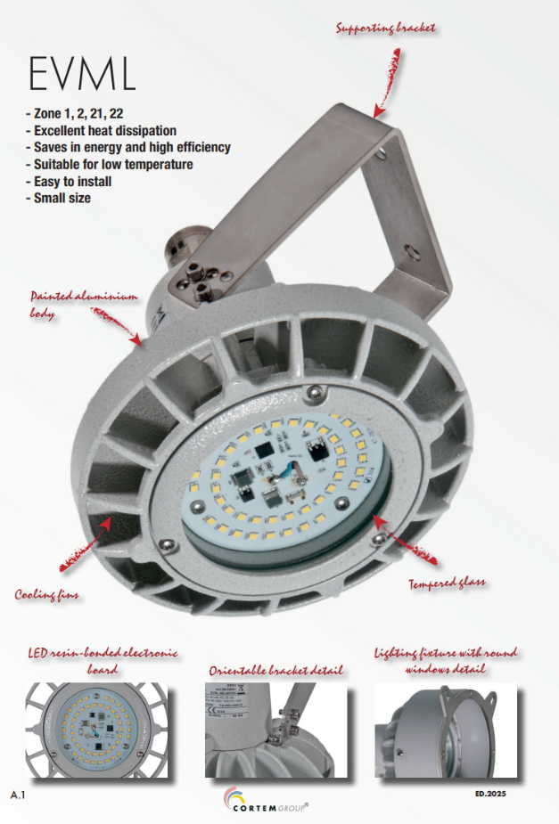 Dòng EVML của Cortem thuộc nhóm Lowbay LED explosion-proof lighting, thiết kế chuyên dụng cho khu vực trần thấp (dưới 6m), hành lang, phòng kỹ thuật, phòng điều khiển, lối đi dưới lòng đất, không gian hẹp trong nhà máy dầu khí – hóa chất – LNG – kho chứa.