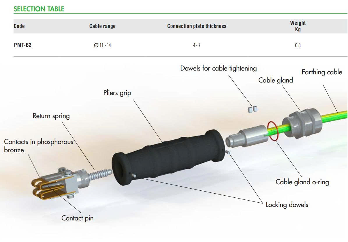 Kẹp tiếp địa PMT được sử dụng để kết nối tàu chở dầu với đất trong quá trình bốc dỡ hàng. Việc tiếp địa chỉ được thực hiện bên trong thân kẹp trong khoang ‘Ex d’ sau khi kẹp đã được kết nối với hệ thống tiếp địa tại chỗ.