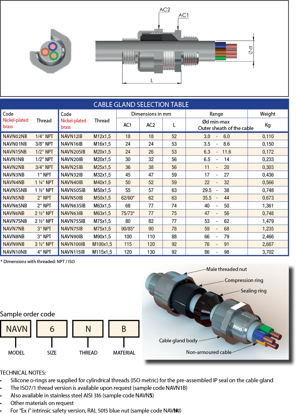 Bộ đệm cáp dòng NAVN, với đầu nối ổ cắm đực, phù hợp sử dụng ở những khu vực có nguy cơ cháy nổ, cho phép lắp trực tiếp cáp không bọc thép vào vỏ chống cháy nổ, đèn chiếu sáng, ổ cắm, phích cắm, v.v.